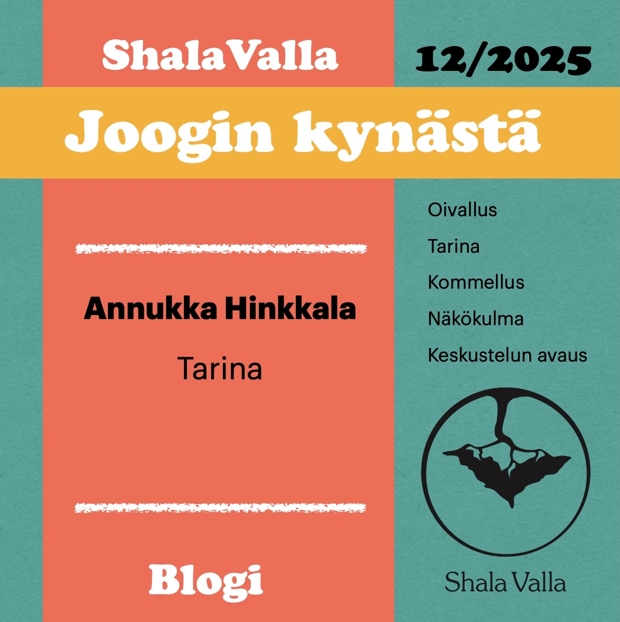 Näin seitsemän vuoden sykliä taaksepäin katsoessa harjoitus on alkanut muuttua. Oppiketjussa on ollut turvallista edetä. Janne Kontalan opit ja kirjallisuus tulivat mukaan muutaman vuoden Astangajooga harjoittelun rinnalle. Harjoitus on edennyt kohti meditatiivisempia harjoitteita, sekä Bhaktijooga on tullut lähelle sydäntä. Tärkeintä ei ole enää niinkään se kuinka taivun fyysisesti, vaan kuin taipuisa olen henkisesti, kuinka myötätuntoinen olen toisia ja itseni kohtaan. Ei niinkään se kuinka vahva olen fyysesti,vaan kuinka vahvana kykenen seisomaan henkisesti kun muu maailma horjuu ympärillämme. Jatkakaamme siis harjoituksia sydän avoinna ja ottakaamme elämän haasteet vastaan siunauksina. Kiitos Annukka ja Joakim, sekä Janne Kontala tärkeistä opeista ja läsnäolostanne. Eteenpäin Uuteen Vuoteen!